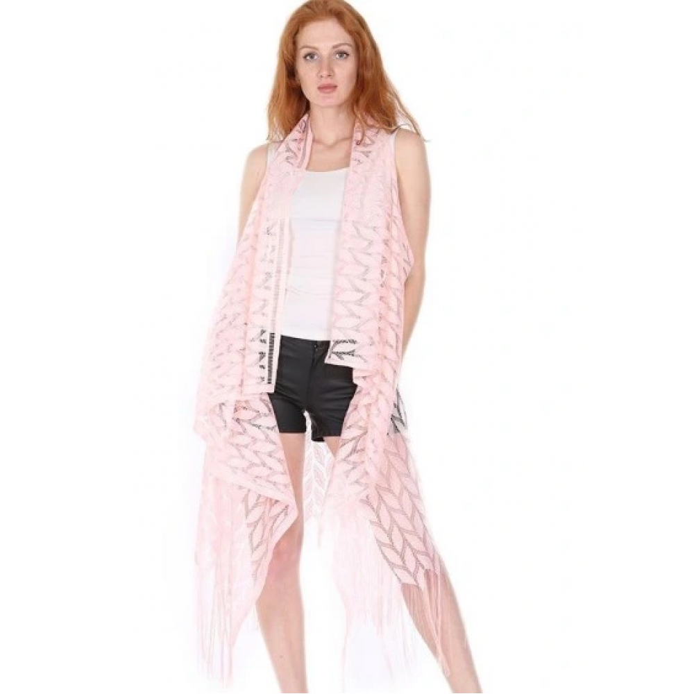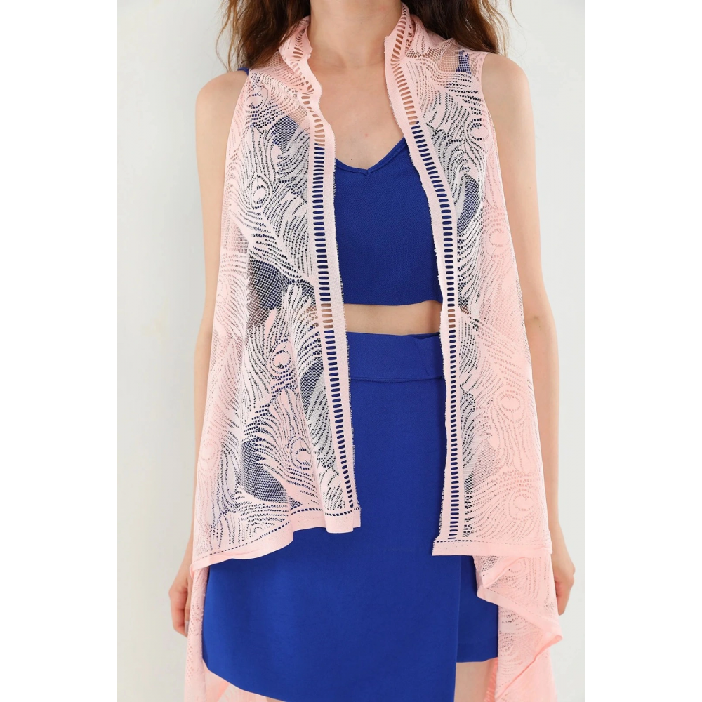 Pareo Dantel Yelek Mayo Bikini Üzeri Yaprak Desenli Püsküllü Plaj Elbisesi - Açık Pembe