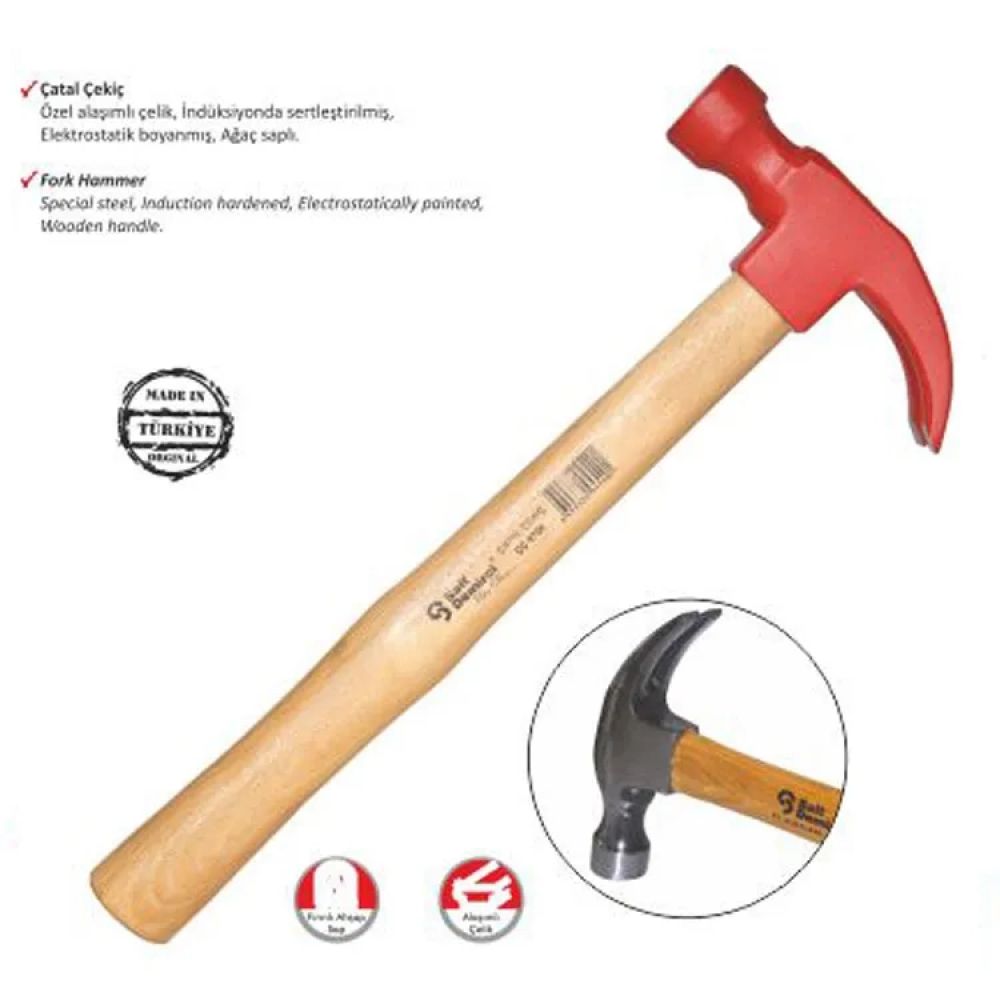 - Polisajlı Çatal Çekiç: Özel alaşımlı çelikten üretilmiş, indüksiyonla sertleştirilmiş ve elektrostatik boyalı sağlam bir yapıya sahiptir. Ergonomik tasarımı sayesinde uzun süreli kullanımda bile yorulmadan çalışmanızı sağlar. Ahşap sapı sayesinde titreşimi azaltır ve konforlu bir kullanım deneyimi sunar. Polisajlı yüzeyi sayesinde paslanmaya karşı dayanıklıdır ve uzun ömürlü kullanım sağlar.