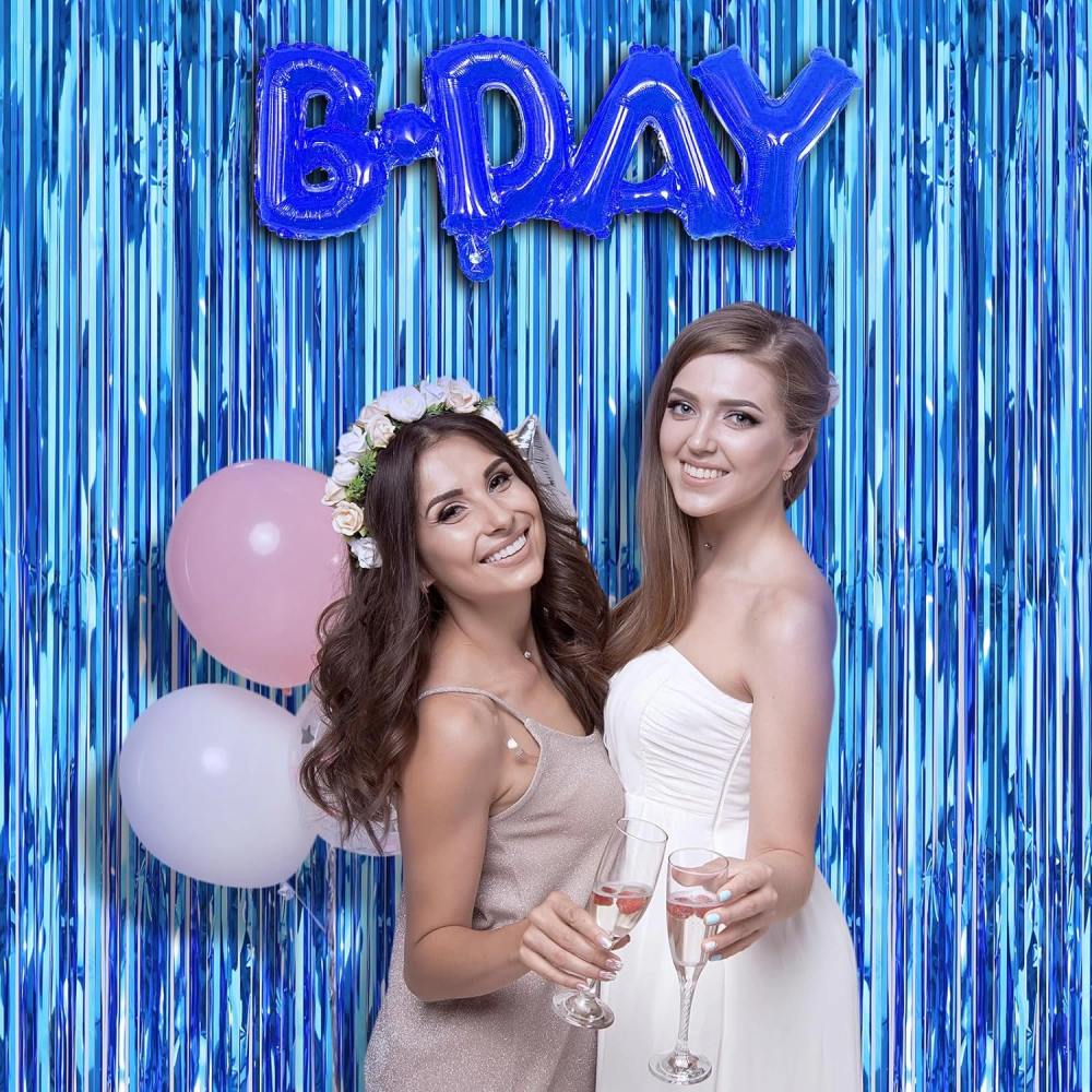 Mavi renk ekstra metalize parlak saçaklı arka fon perdesi ile özel günlerinize ve kutlamalarınıza göz kamaştırıcı bir ışıltı katın! İthal A kalite malzemeden üretilen bu perde, 1x2 metre boyutuyla her türlü dekorasyona uyum sağlar.