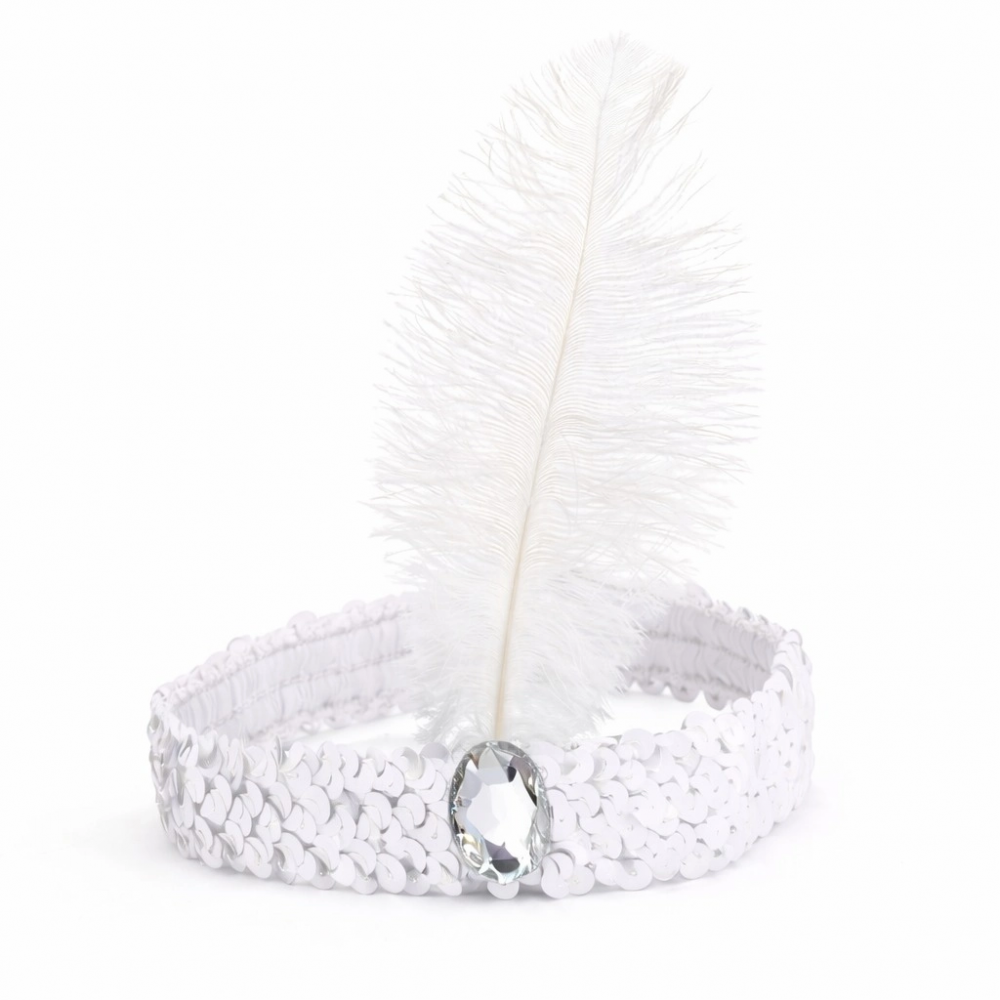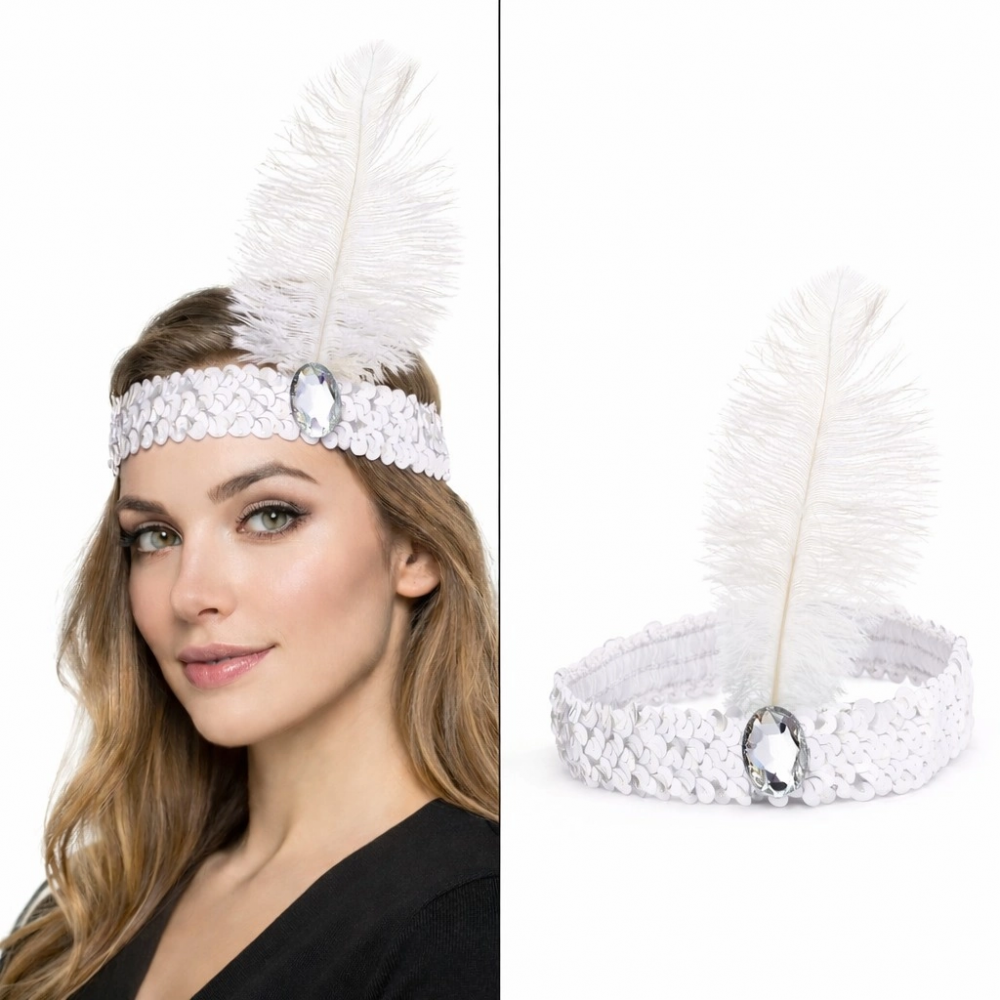Beyaz tüylü ve taş detaylı Charleston saç bandı, retro parti konseptleri için özel olarak tasarlanmış şık bir aksesuardır. Parlak payetli yapısı ve dikkat çekici beyaz tüy detayı sayesinde 70-80-90’lar temalı eğlencelerde stilinizi tamamlar.