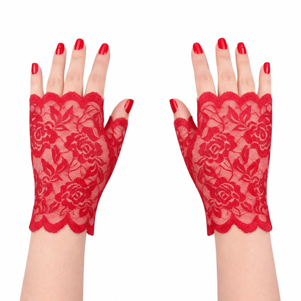 Zarif ve dikkat çekici tasarımıyla öne çıkan kırmızı gül desenli dantel parmaksız eldiven, özel günler, parti organizasyonları ve kostüm kombinleri için ideal bir aksesuardır. İnce dantel dokusu ve gül desenli tasarımı ürüne estetik ve şık bir görünüm kazandırır.