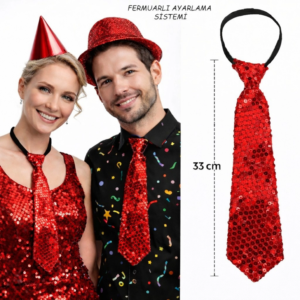 Parlak kırmızı rengi ve göz alıcı pul payet kaplaması ile bu parti kravatı, bulunduğunuz ortamda tüm dikkatleri üzerinize çeker. Işığı yansıtan yüzeyi sayesinde sahne, doğum günü, yılbaşı, konsept parti ve özel organizasyonlarda enerjik bir görünüm sunar.
