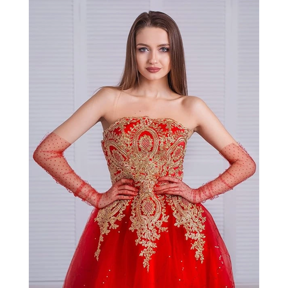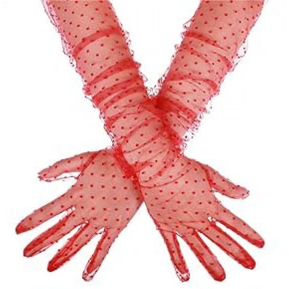 Uzun Boy Kırmızı Puantiyeli Kırmızı Renk Tül Eldiven