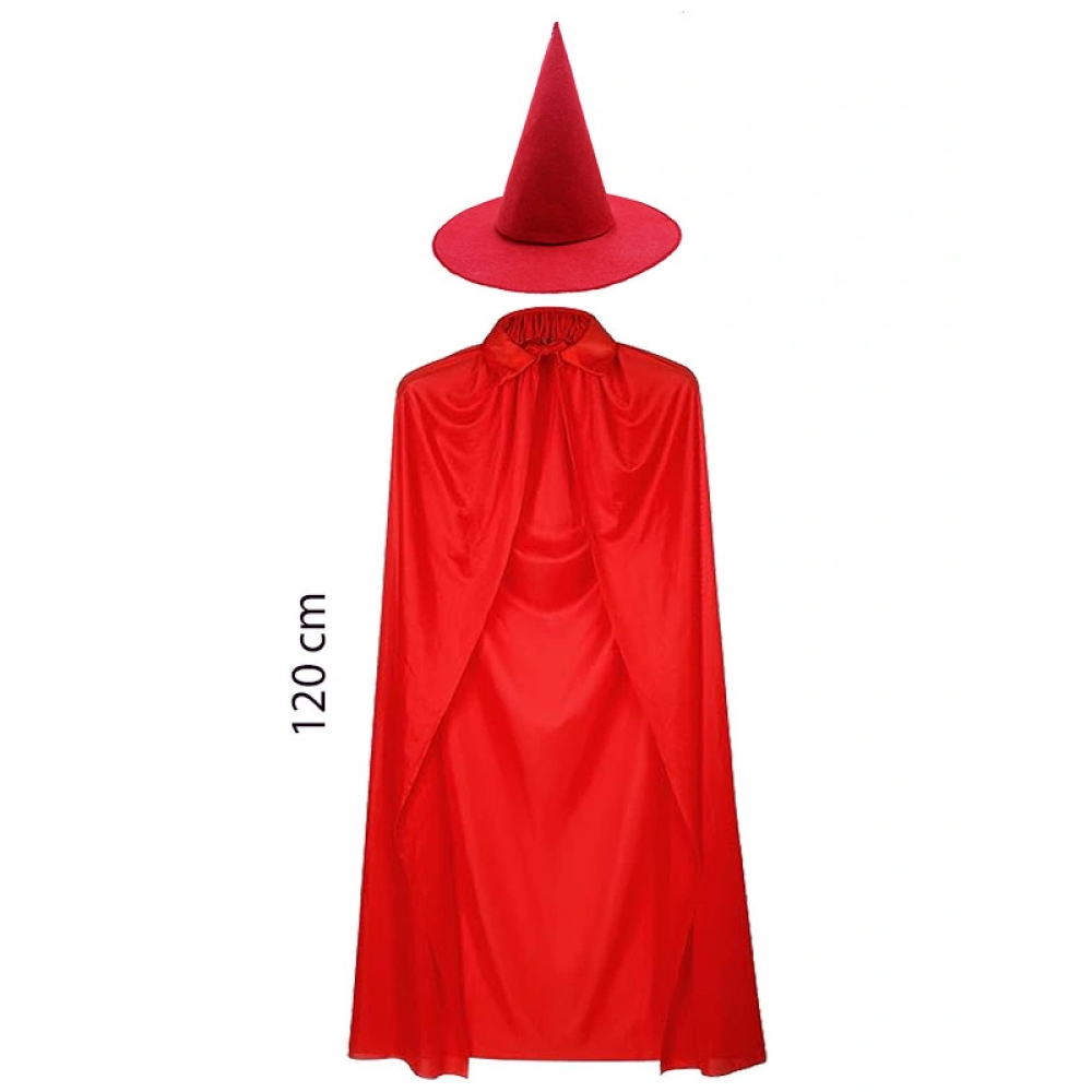 Yetişkin Boy 120 Cm Kırmızı Yakalı Pelerin Ve Kırmızı Cadı Şapkası CSM-4341