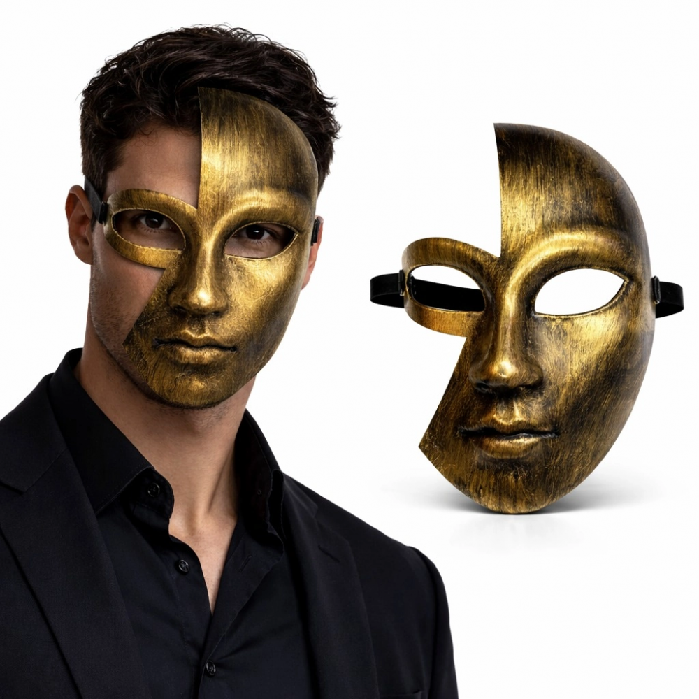 Antik efektli altın yarım yüz maskesi ile dikkat çekici ve karizmatik bir görünüm elde edin. Metalik gold yüzeyi ve özel eskitme dokusu sayesinde güçlü, gizemli ve sahneye yakışan bir stil sunar.