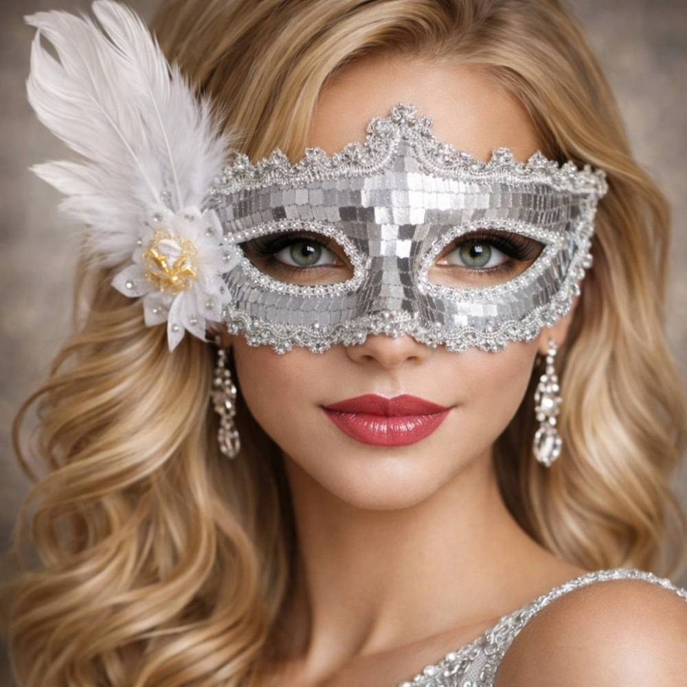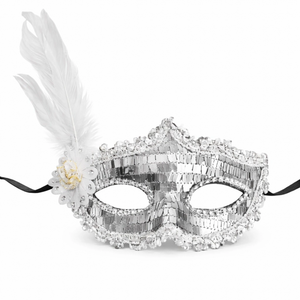 Işıltılı ve zarif tasarımıyla öne çıkan gümüş Venedik maskesi, parlak pul payet kaplama yüzeyi ve taş işlemeli göz çevresiyle dikkat çeker. Yan bölümde bulunan tüy ve dekoratif detay maskeye şık ve sofistike bir hava kazandırır.