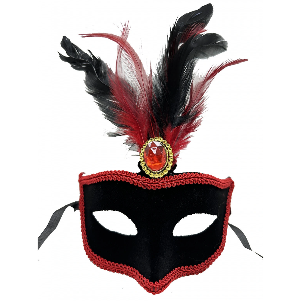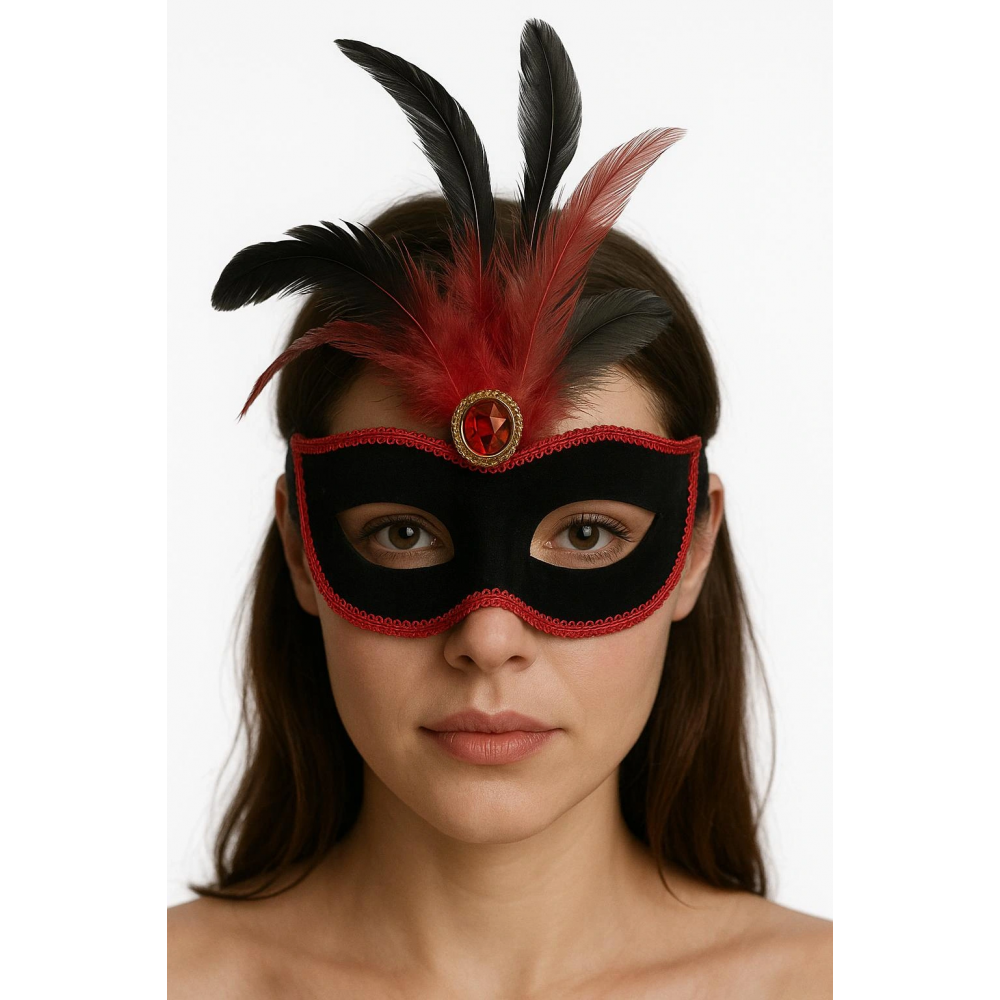 - Kırmızı dantel, siyah ve kırmızı tüyler ve siyah süet kaplama ile süslenmiş göz alıcı bir parti maskesi tasarımı.