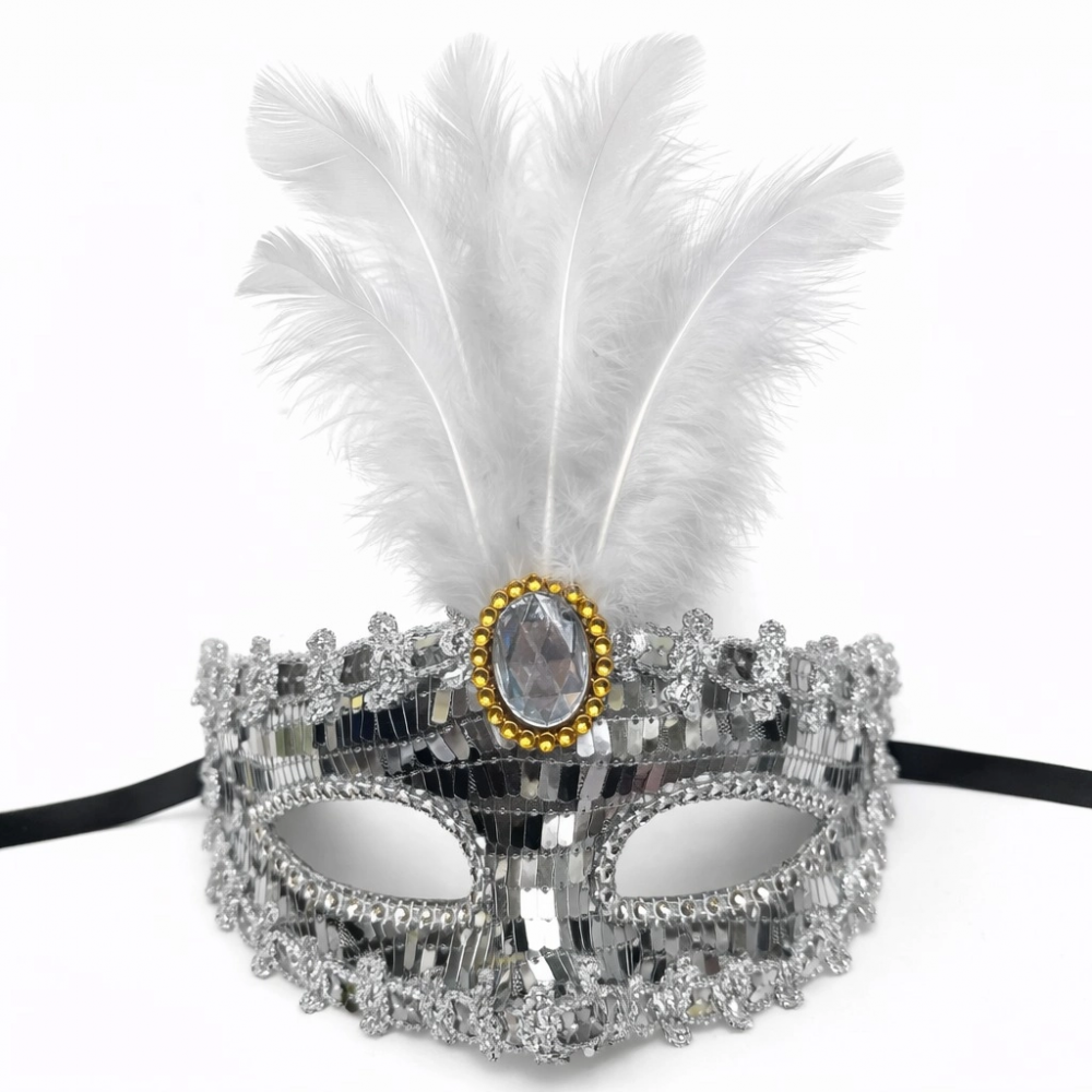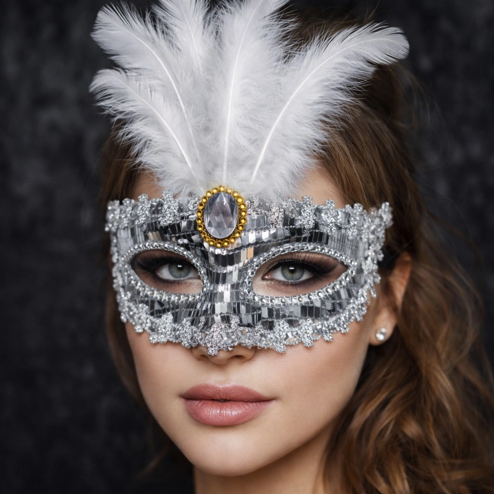 Zarafeti ve ışıltıyı bir arada sunan Gümüş Tüylü Taşlı Balo Maskesi, şık davetler ve konsept organizasyonlar için tasarlanmıştır.