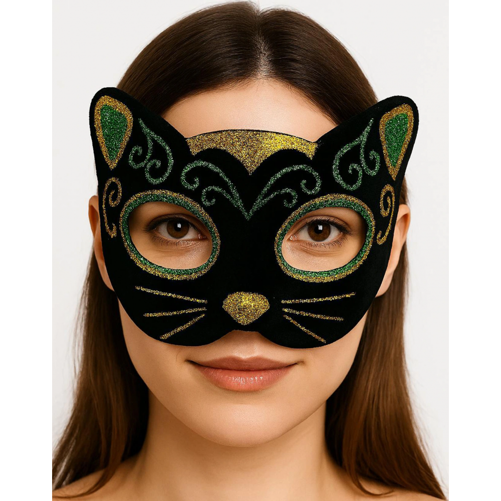 Siyah Kadife Kaplama Üzeri Sarı Yeşil Sim İşlemeli Kedi Maskesi (20x13 cm)