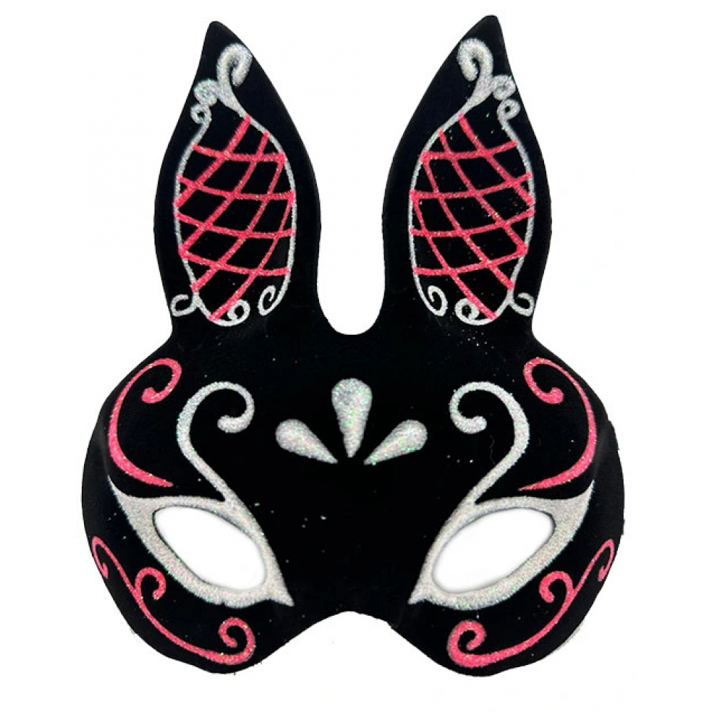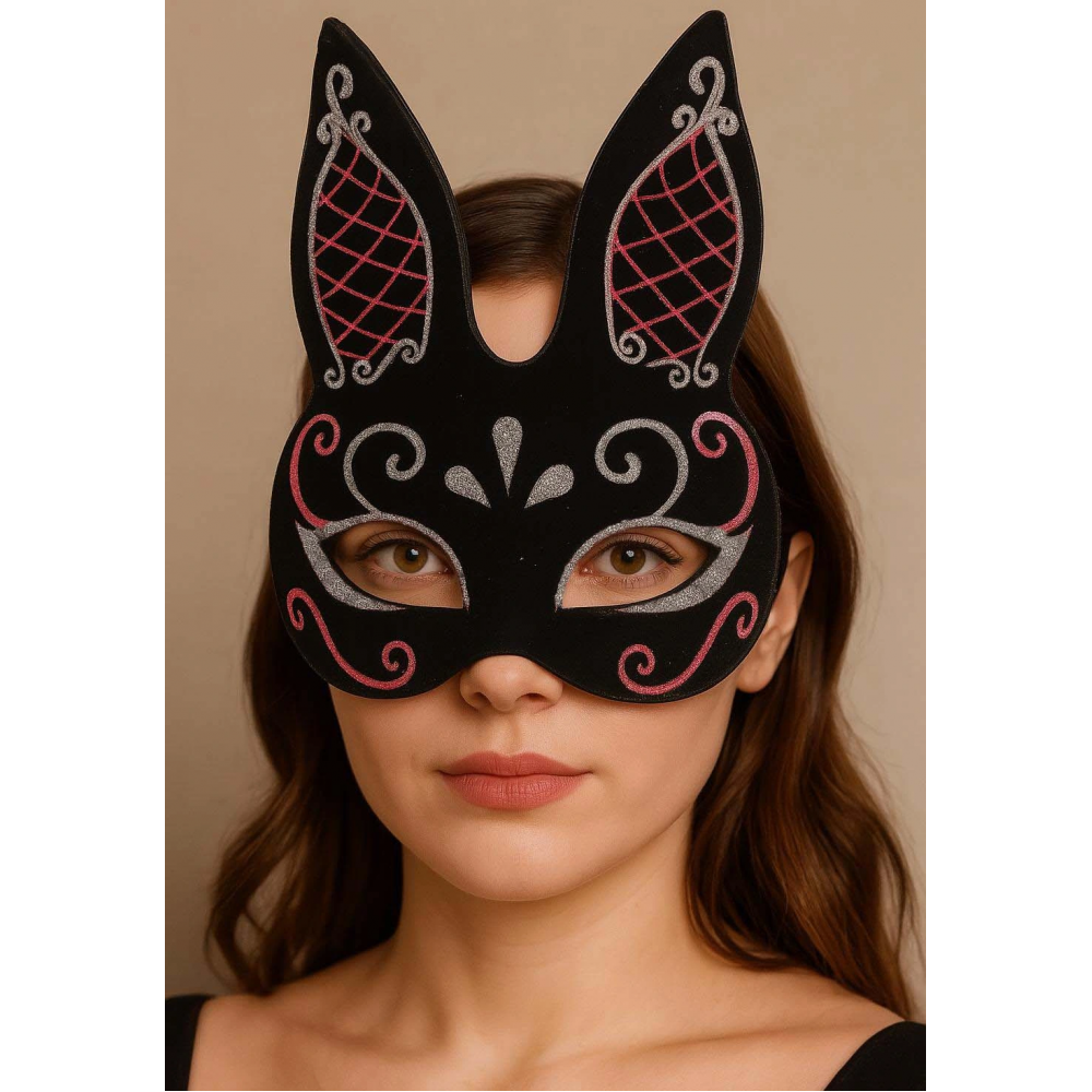 Siyah Süet, Kırmızı Beyaz Simli Tavşan Maskesi