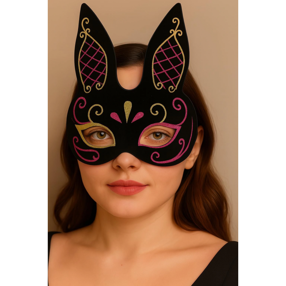 Siyah süet ve kırmızı gold simli tavşan maskemizi hemen satın alın ve siz de büyüleyici bir görünüm elde edin!