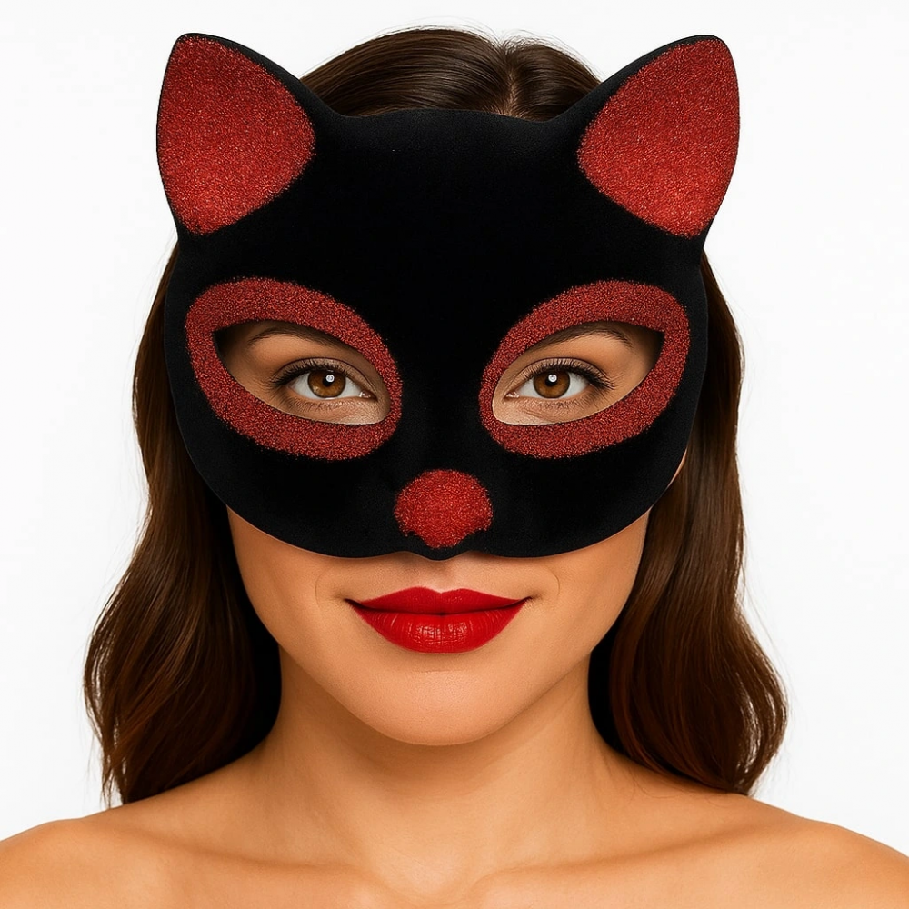 Balolar ve özel günler için mükemmel bir aksesuar olan Siyah Renk Kırmızı Simli Süet Kedi Maskesi ile göz kamaştırın!