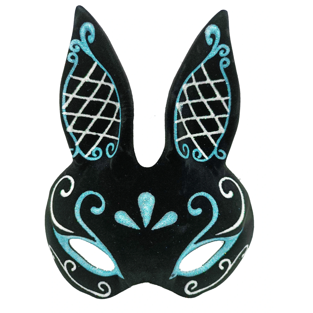 Gizemli ve büyüleyici bir görünüm için siyah süet kaplama, mavi beyaz simli tavşan maskemiz tam size göre!