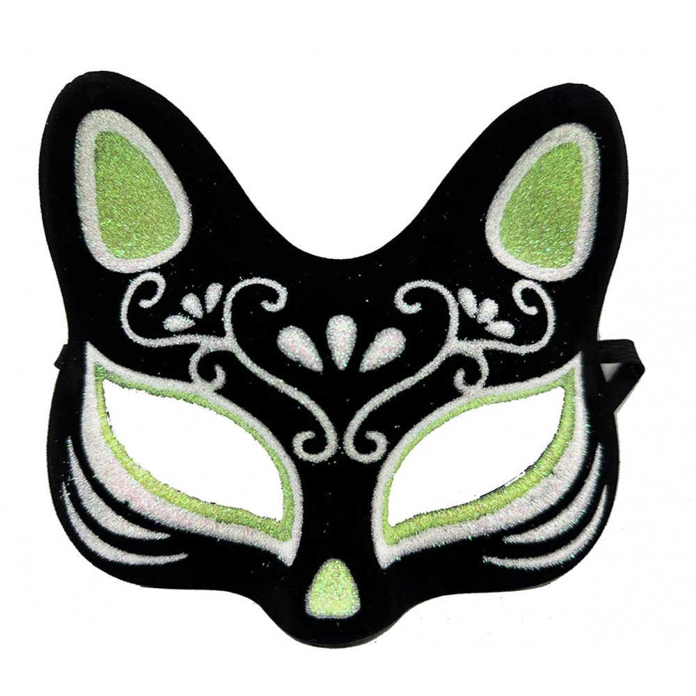 Siyah Renk Üzeri Gümüş Yeşil Simli Süet Kaplama Kedi Maskesi ile Kostüm Partisine Hazır Olun!