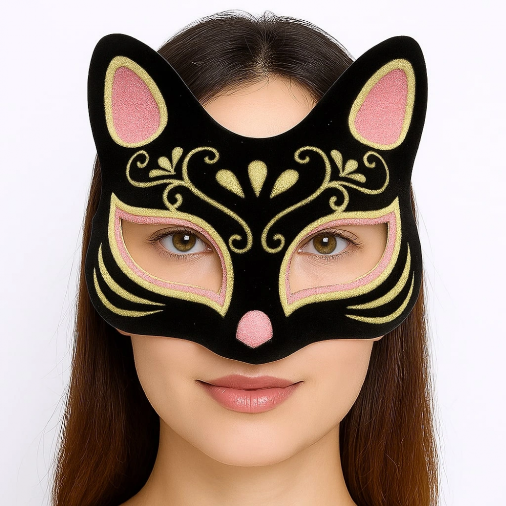 Siyah Renk Üzeri Pembe Sarı Simli Süet Kaplama Kedi Maskesi ile Kostüm Partisine Hazır Olun!