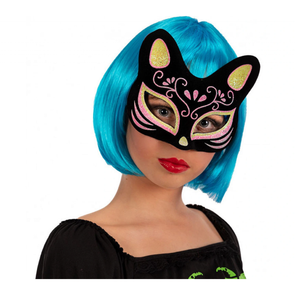 Siyah Renk Üzeri Pembe Sarı Simli Süet Kaplama Kedi Maskesi ile gizemli ve etkileyici bir görünüm oluşturun ve Kostüm Partisine hazır olun!