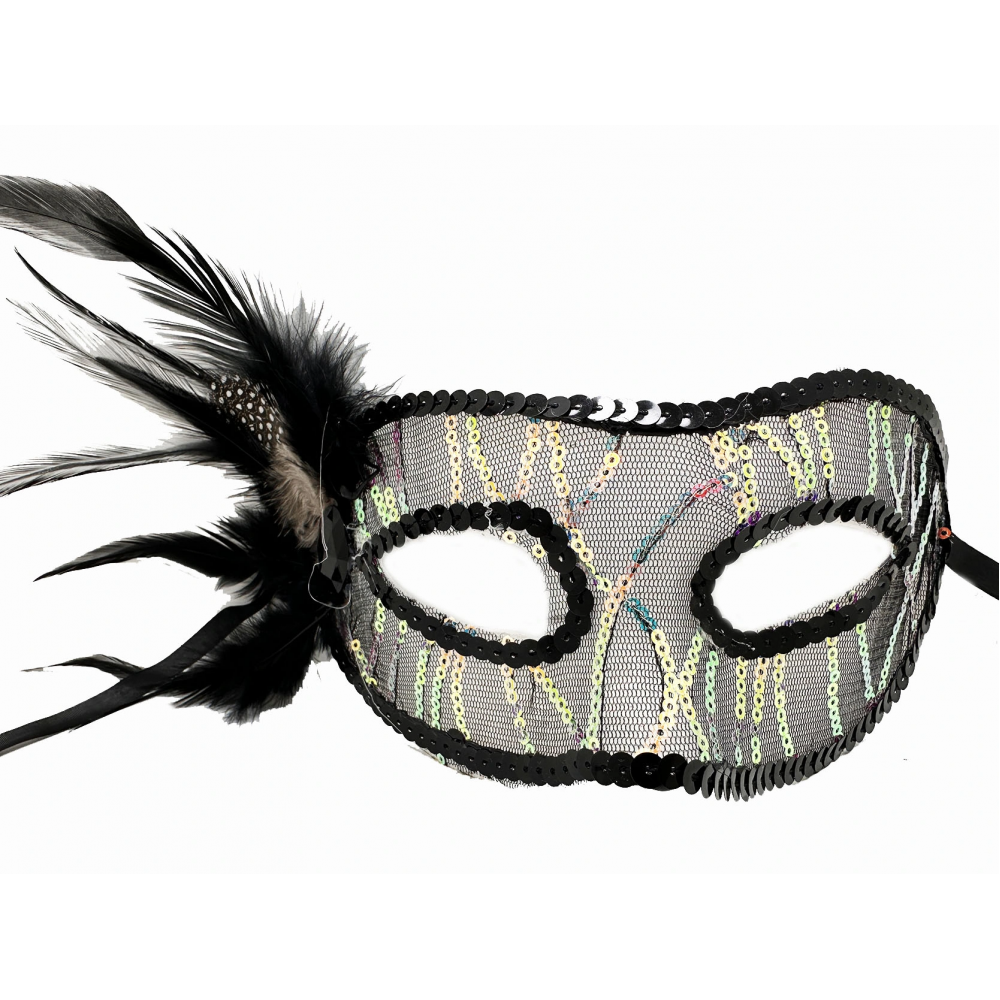 Siyah Renk Yandan Tüylü Pul Payet İşlemeli Parti Maskesi, balolar, maskeli partiler gibi özel günlerde göz alıcı ve özgün bir görünüm elde etmek isteyenler için mükemmel bir seçimdir. Siyah tüylü tasarımı ve parlak pulları ile bu maske sizi partinin en dikkat çekici konuğu yapacak.