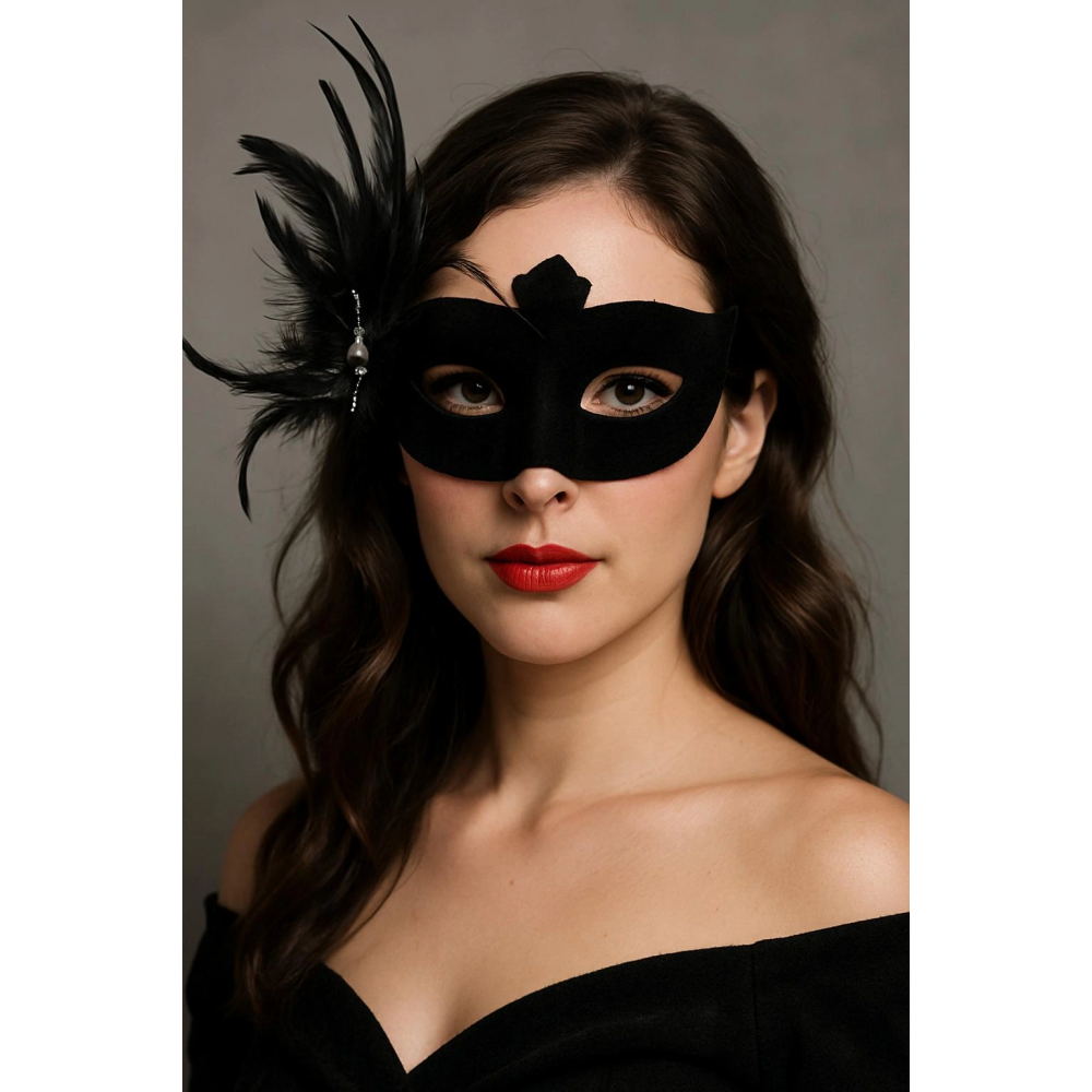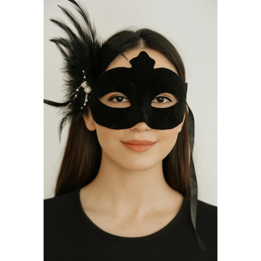Siyah Renk Yandan Tüylü Süet Kaplama Beyaz İncili Parti Maskesi, balolar, maskeli partiler gibi özel günlerde gizemli ve göz alıcı bir görünüm elde etmek isteyenler için mükemmel bir seçimdir. Yumuşak süet kaplaması ve zarif beyaz incileri ile bu maske sizi partinin yıldızı yapacak.