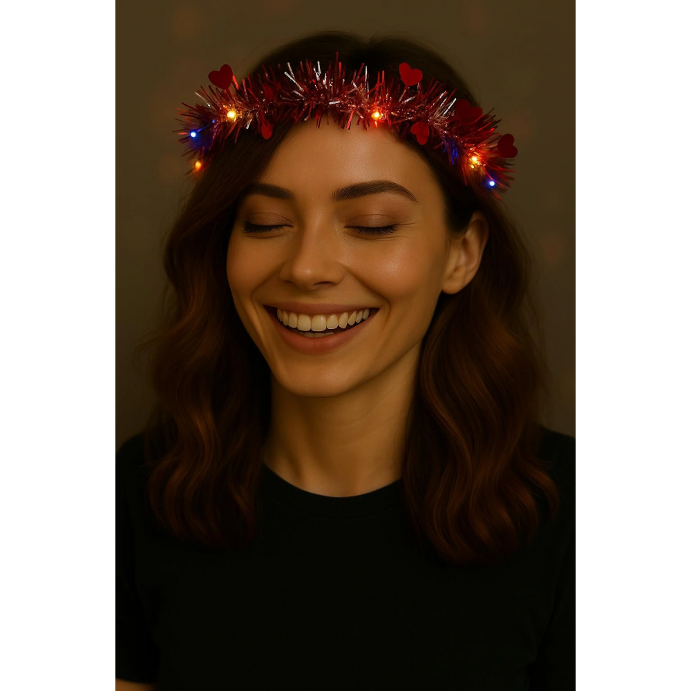 - 1 adet Kalp Püsküllü Gece Parıltısı LED'li Işıklı Taç (Kırmızı Renk)