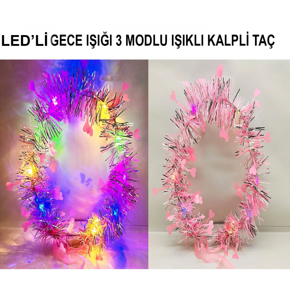 - 1 adet Kalp Püsküllü Gece Parıltısı 3 Modlu LED'li Işıklı Taç (Pembe Renk)