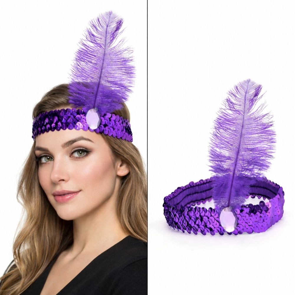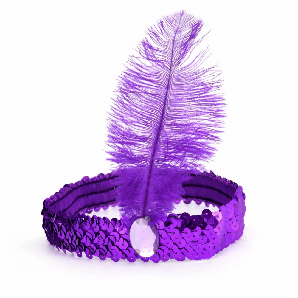 Mor tüylü ve taş detaylı Charleston saç bandı, retro parti konseptleri için özel olarak tasarlanmış şık bir aksesuardır. Parlak payetli yapısı ve dikkat çekici mor tüy detayı sayesinde 70-80-90’lar temalı eğlencelerde stilinizi tamamlar.