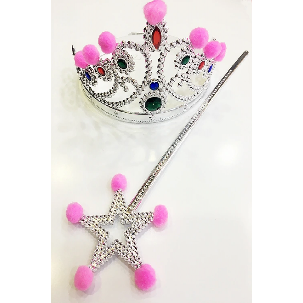 Pembe Ponponlu Gümüş Renk Prenses Tacı Ve Gümüş Renk Prenses Asası CSM-1723