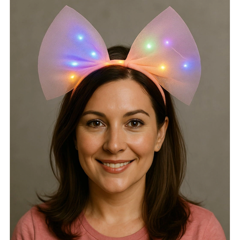 Bu güzel tül parti tacı, her partiye veya özel vesileye renk katmak için mükemmeldir. Tacın pembe fiyonk şekli ve rengarenk LED ışıkları onu göz alıcı bir aksesuar haline getirir. 25x25 cm boyutlarındadır ve çoğu yetişkin ve çocuğa uygundur.