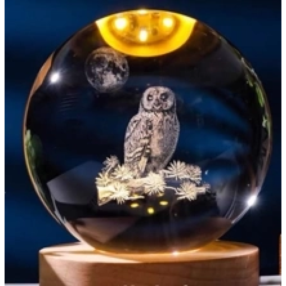 Dekoratif Baykuş Tasarımlı Ahşap Altlıklı Işıklı Cam Küre Büyük Boy 8cm C1YSP-SST-797